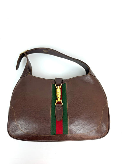 The Gucci Jackie Sherry Line Handbag combines the iconic Jackie bag design with the brand's signature Sherry Line pattern. Known for its sleek, structured shape and the distinctive piston closure, this bag blends luxury with functionality.